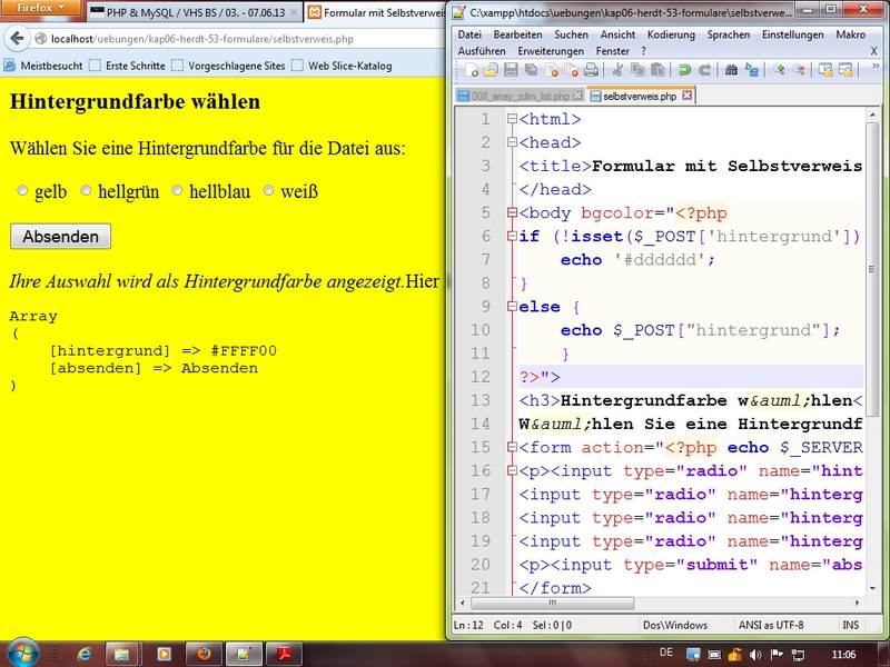 Formulare: sich selbst aufrufende Formulare; Nutzung von $PHP_SELF erzeugt Meldungen - also$_SERVER['PHP_SELF']nutzen - Dateihandling
