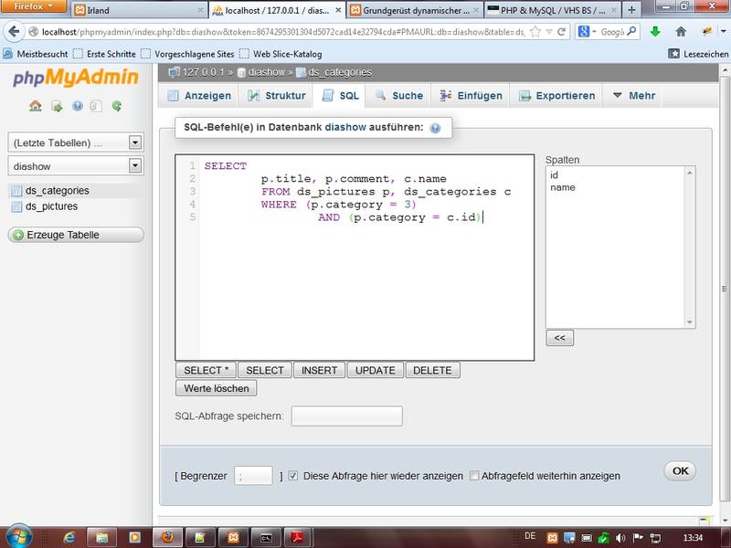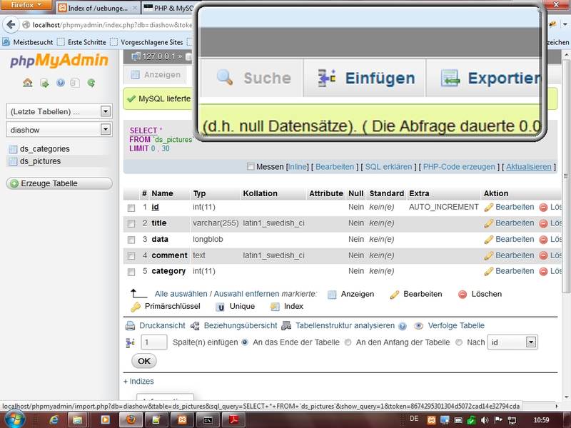 Datenbank diashow anlegen, Tabellen ds_pictures und ds_categories anlegen und Felder mit Eigenschaften ausstatten nach Vorgaben