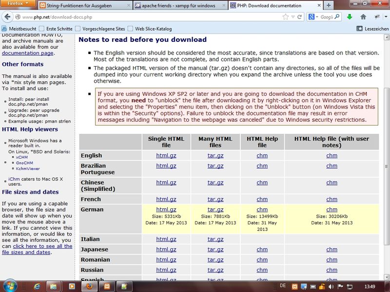 Übung: Bereitstellung der PHP-Hilfe als CHM-Datei - wichtig: CHM-Dateien müssen seit Windows XP SP2 erst bei Kontextmenü "zugelassen" werden