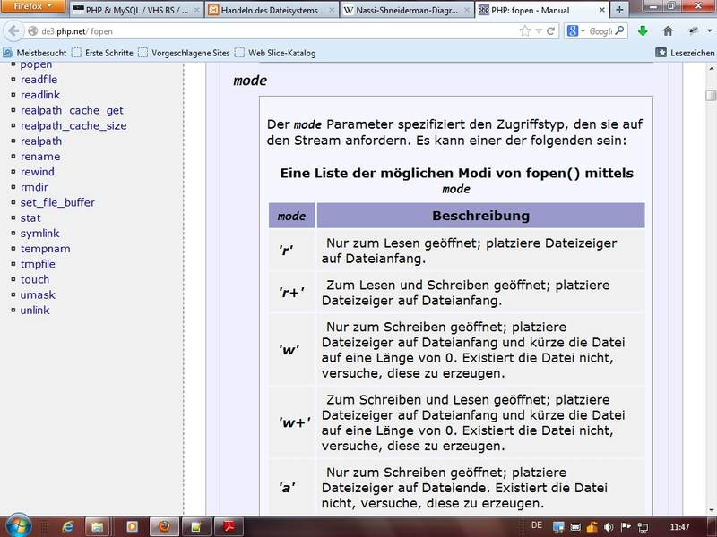 File-Handle übernehmen mitfopen(Link php.net)und schließen mitfclose(zurückgeben/schließen bitte nicht vergessen!), Unterschiedliche Modi für den Dateizugriff (siehe fopen in Manual); weitere Funktionen: