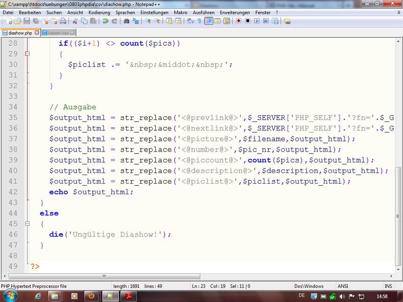 // Template laden $output_html = implode('',file('template.htm')); // CSV-Datei einlesen $pics = file($_GET['fn']); // Nummer des anzuzeigenden Bildes festlegen $pic_nr = $_GET['nr'] ? $_GET['nr'] : 1; // Bilddatensatz laden list($filename,$description) = explode(';',$pics[$pic_nr-1]);Codeschnippsel aus Diashow; der Skriptablauf wurde im Seminar ausgiebig analysiert