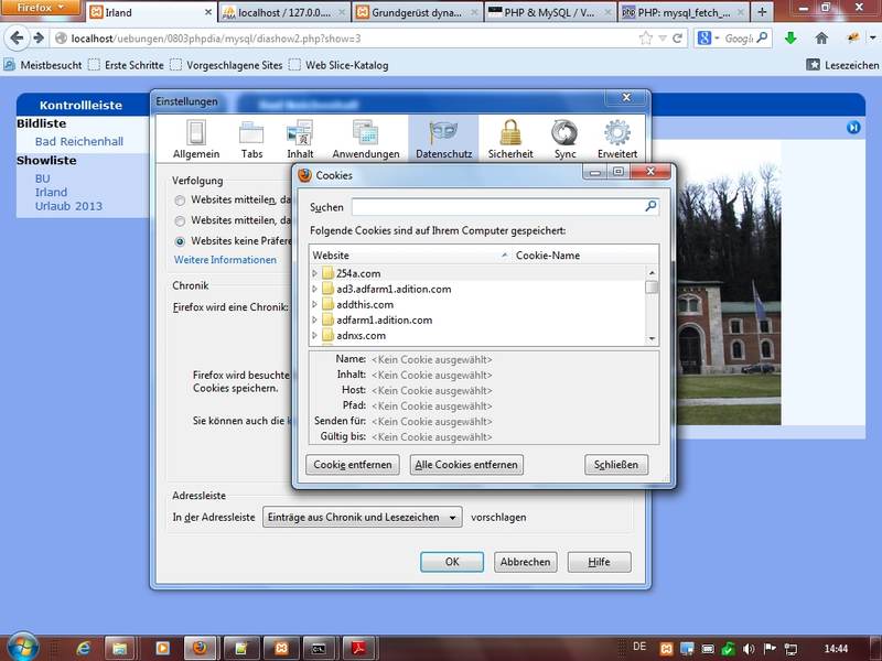 Cookies: Server legen Text/Infoseiten auf Client-Seite ab; Einsatzbeispiel: Infos zu Warenkorb, Merkzettel & Co; ID einer Session hinterlegen, Verwaltung mittels Superglobal$_COOKIE, Befehl (Link php.net):setcookie(); jeder Browser legt eigene Cookie-Verwaltung an; Beim Firefox erhalten Sie aktuell über die Einstellungen - Register Datenschutz - Link Cookies eine Übersicht, beim MS Internet Explorer findet man die Cookie-Textdateien in der Ordnerstruktur c:\Users\username\AppData\Roaming\Microsoft\Windows\Cookies