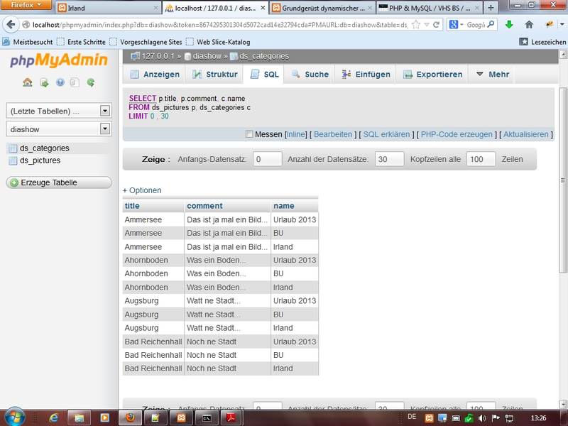 SELECT p.title, p.comment, c.name FROM ds_pictures p, ds_categories c WHERE (p.category = 1) and (p.category = c.id)Experimente ergeben wichtige Bedingung mit WHERE bestehend aus p.category=1 (bitte die Show mit der Nummer 1 auslesen) und gleichzeitig auch die Bedingung, dass die Ergebnisse in der Tabelle ds_categories im Feld "id" auch diese Nummer haben müssen; sonst ergeben sich "mutierte" Ergebnisse (Beispiel: in ds_pictures entsprechen 2 Datensätze der Bedingung category=1; aber wir haben drei Kategorien in Tabelle ds_categories - dann hätten wir 2 mal 3 gleich 6 Datensätze in unserem Ergebnis -> wir brauchen die Verbindung mit der Bedingung p.category=c.id !