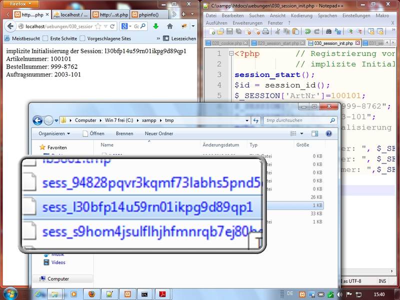 Sessions werden serverseitig verwaltet (siehe Infos bei phpinfo - session; Anmerkungen zu session.name - PHPSESSID bitte nicht verwechseln mit einer Session-ID), XAMPP--Session-Speicher-Pfad (session.save_path) aufC:\xampp\tmp, Verwaltung mittels Superglobal$_SESSION, Befehle:session_start(), session_destroy, $id = session_id() - Verteilung von Ausdrucken zu Übungen und Techniken