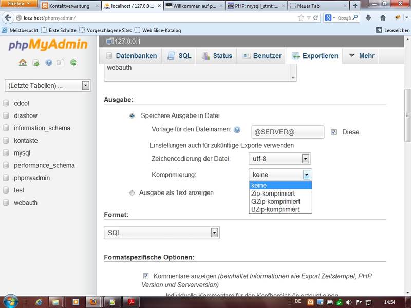mit PhpMyAdmin DBs /Tabellen per Exportieren und Importieren Dateien mit und ohne Kompression (sql, zip, bz2),