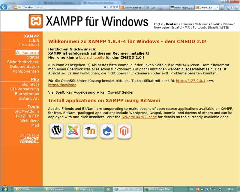 Anm.: die momentanen Prüfungsumgebungen des CMSOD laufen alle mit Version 1.7.4 (PHP 5.3) - XAMPP (Inbetriebnahme der Spezialedition für den CMSOD)