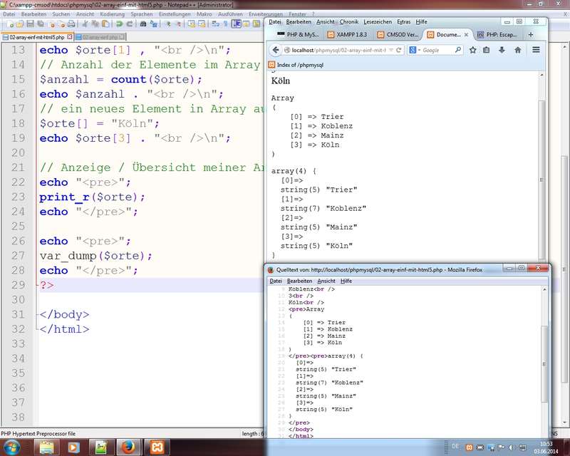 Ausgabe (zu Testzwecken) von Arrays mit Funktionen print_r und var_dump (Tipp: Einschachtelung in pre-Tags für formatierte Ausgabe)