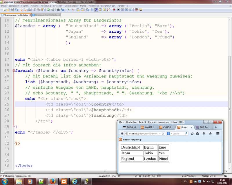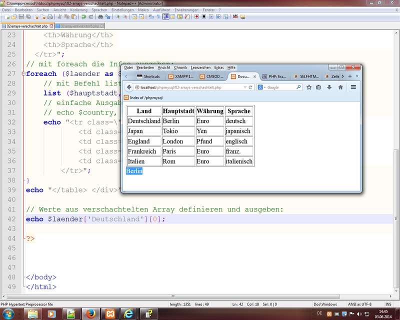 Mehrdimensioale Array mittels Verschachtelung von Array - dann mittels $laender ['Deutschland'] [0] - Escape-Sequenzen (Link php.net)