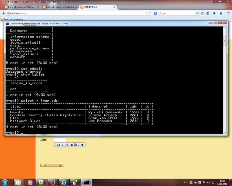 SQL Structured Query Language (viele Dialekte aber gemeinsame Basis), Client-Server Prinzip; Client in Konsole (Eingabeaufforderung)mysqlgezeigt (Kommandozeilentool in cmd; bei XAMPP in XAMPP-Ordner\mysql\bin), Beispielzeilen: