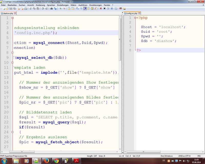 Analyse der zwei Skripte: diashow.php, config.inc.php (Konfigurationsdaten passend setzen und DB-Name bestimmen)