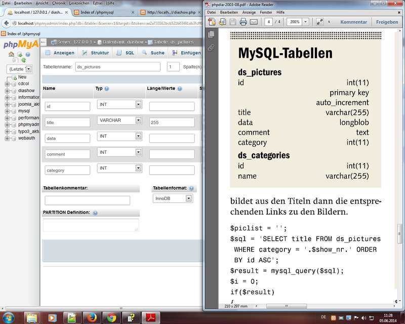 Datenbank diashow anlegen, Tabellen ds_pictures und ds_categories anlegen und Felder mit Eigenschaften ausstatten nach Vorgaben