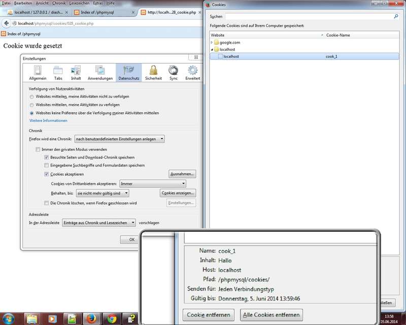 Cookies: Server legen Text/Infoseiten auf Client-Seite ab; Einsatzbeispiel: Infos zu Warenkorb, Merkzettel & Co; ID einer Session hinterlegen, Verwaltung mittels Superglobal$_COOKIE, Befehl (Link php.net):setcookie(); jeder Browser legt eigene Cookie-Verwaltung an; Beim Firefox erhalten Sie aktuell über die Einstellungen - Register Datenschutz - Link Cookies eine Übersicht, beim MS Internet Explorer findet man die Cookie-Textdateien in der Ordnerstruktur c:\Users\username\AppData\Roaming\Microsoft\Windows\Cookies