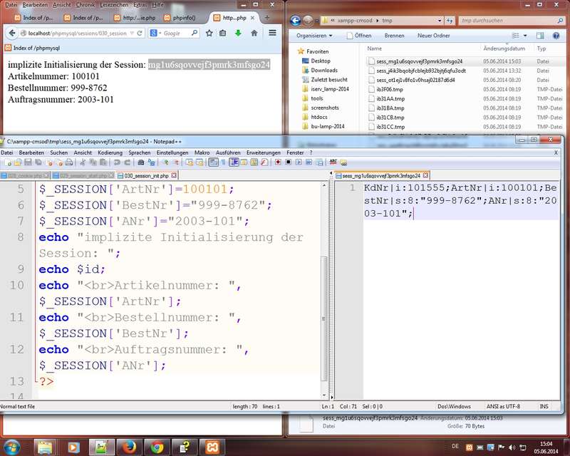 Sessions werden serverseitig verwaltet (siehe Infos bei phpinfo - session; Anmerkungen zu session.name - PHPSESSID bitte nicht verwechseln mit einer Session-ID), XAMPP--Session-Speicher-Pfad (session.save_path) aufC:\xampp\tmp, Verwaltung mittels Superglobal$_SESSION, Befehle:session_start(), session_destroy, $id = session_id() - OOP (Objektorientierte Programmierung - Teil I)