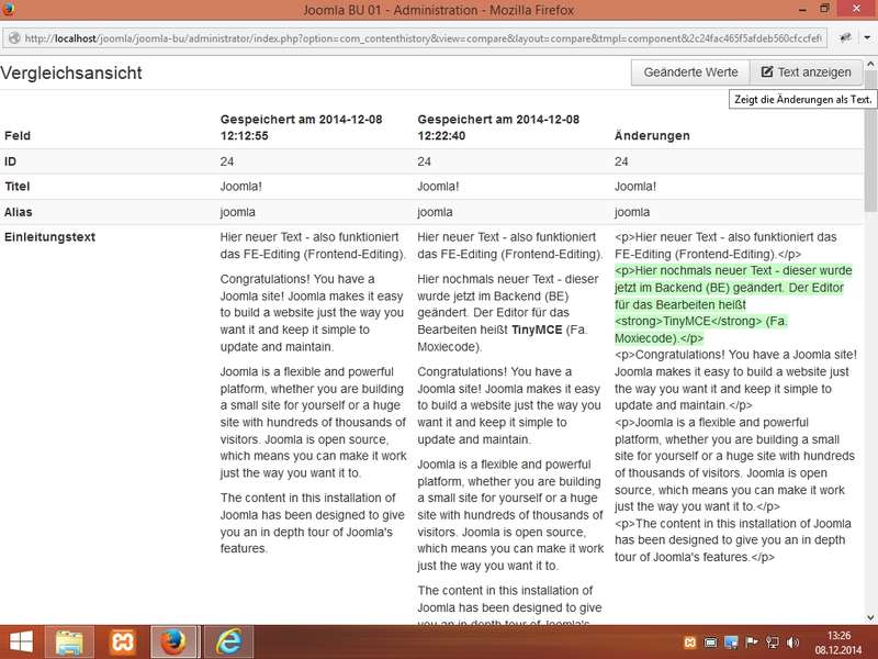 seit Version 3.2 die Möglichkeit zu Beitragsversionen; Konfiguration über Menü Beiträge - Optionen - Verlauf speichern und Anzahl der Versionen festlegbar; Beitragsversionen lassen sich visuell vergleichen und gezielt wiederherstellen - BE-Konfiguration