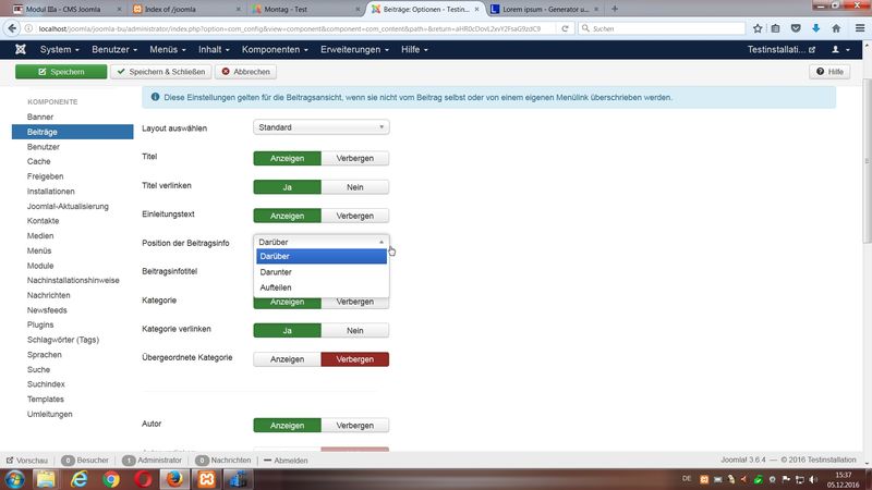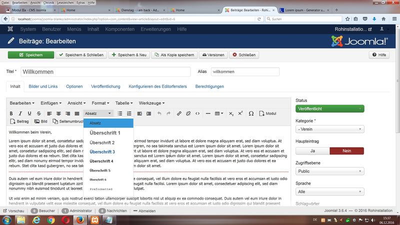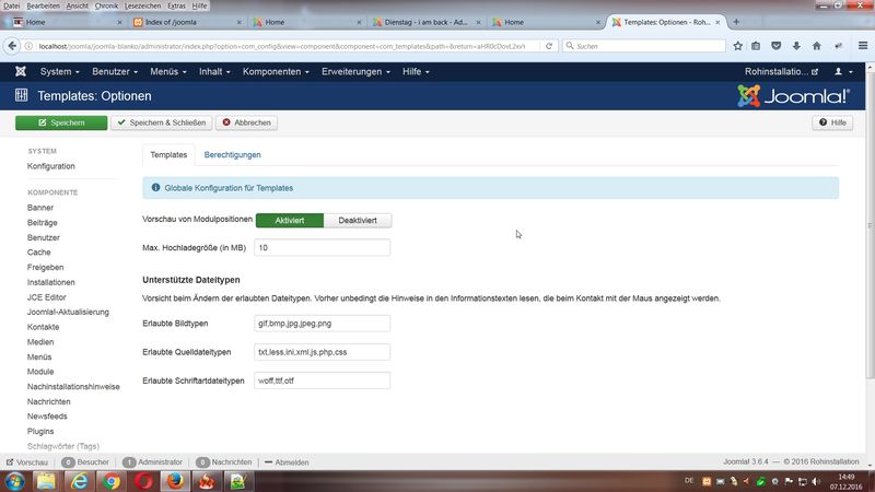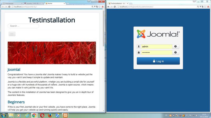 FE und BE aufrufen und Testen des BE-Zugangs (Adresse der Site plus Ordner/URL administrator)