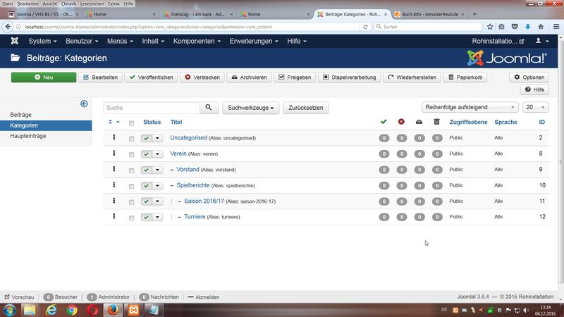 Kategorien der Beispielinstallation "Joomla! erlernen" mit Hilfe unterschiedlicher Filter und Ansichten analysiert