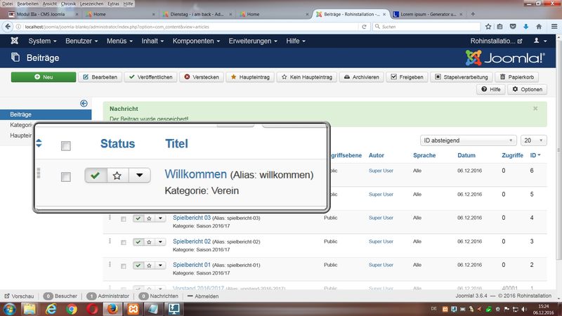 Erste Darstellung von Menüs in Menü "main menu" und "top" und Festlegen der Startseite (Stern in Menü - auf Beispielinstallation vom Typ "Beiträge- Haupteinträge"; also einer Blogansicht für alle Beiträge mit der Eigenschaft "Haupteintrag") - Optionen (Globale Einstellungen - Beiträge)