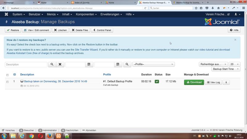 Übung: Akeeba Backup Core Komponente installiert und Backup-Archiv erstellt;