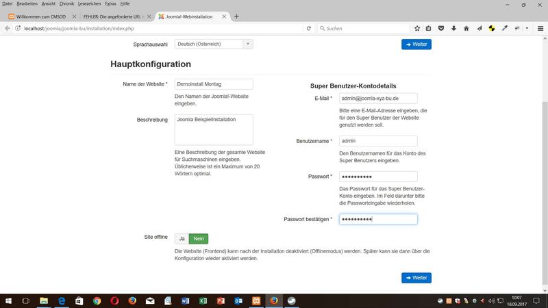 Anm.: wenn Sie die Joomla-interne Update-Technik ausprobieren wollen, dann können Sie später gerne auch Vorgängerversionen nutzen.Technik Info Bemerkung Lokal C:\xampp-cmsod\htdocs\joomla\joomla-buhtdocs hier mit Unterordnerstruktur Web http://localhost/joomla/joomla-buimmer über htdocs aufrufen