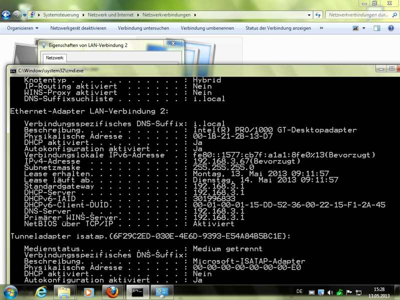 Erste Tests in der Befehlszeile (cmd): Toolsping, ipconfig /all, arp -a