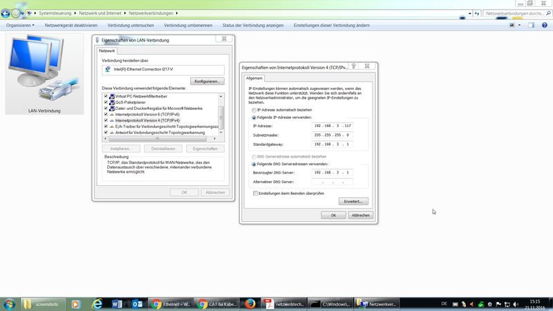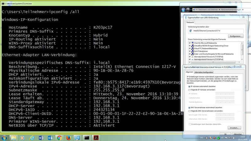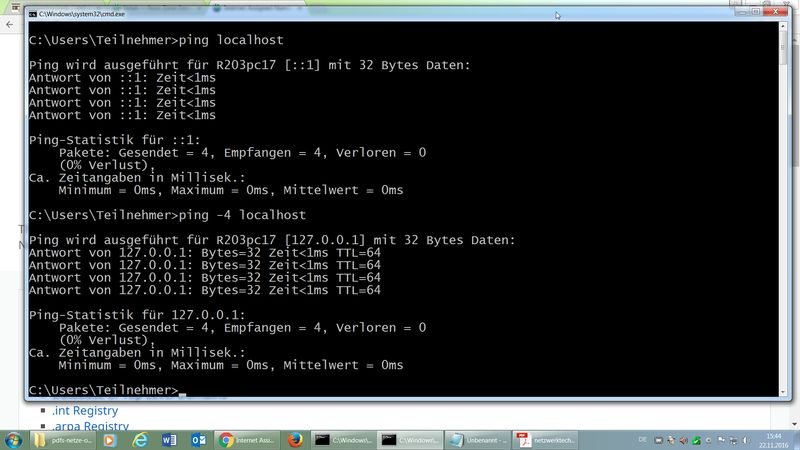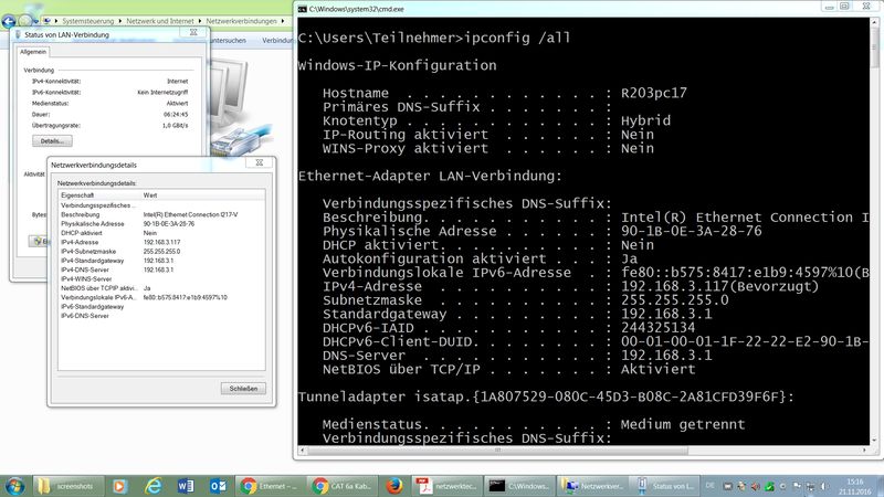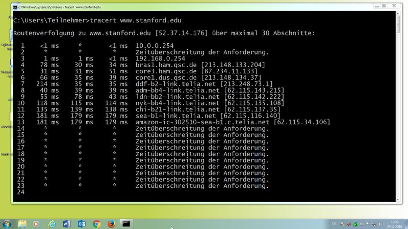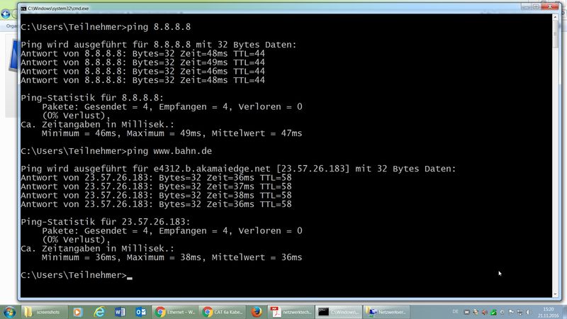 Anm.: über Windows-GUI mittels Netzwerk- und Freigabecenter - Adapter - ... Detailsping www.bahn.de(der Profitest für eine funktionsfähige Onlineverbindung für einen Rechner)tracert www.stanford.edu(Route der Pakete durch das Internet zum Zielrechnerarp -a(Adress Resolution Protocol - Zuordnungen von MAC-Adressen zu IPv4-Adressen)