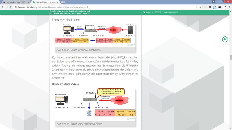 ermöglicht mittels Zuordnung von Anfragen aus Privatem Netz (LAN - Adresse : Port) zu Antworten aus dem Öffentlichen Netz (WAN - Adresse : Port) die gleichzeitige Nutzung einer einzigen Internetverbindung mit einer öffentlichen IP und eine (sichere) Blockade nicht gewünschter Pakete in Richtung LAN;