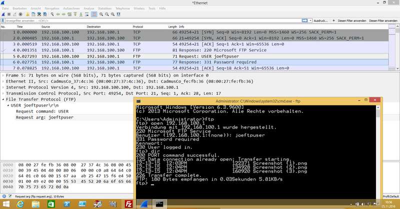 Sicherheitsanalyse mit Tool Wireshark (früher Ethereal) zum Nachweis, dass die Benutzerdaten (ohne Verschlüsselung) im Klartext durch das Netz gehen; Empfehlung daher: Secure FTP (eigentlich SSH - Secure Shell)