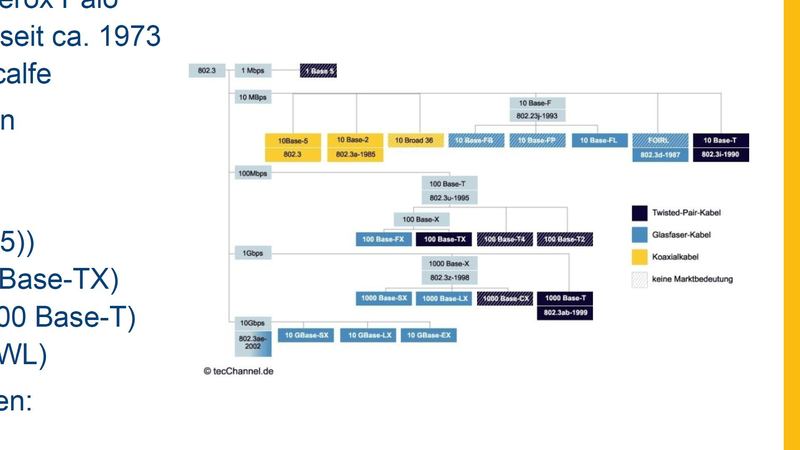 Bus: Kollisionen als Prinzip, Standard als Ethernet mit CSMA/CD (Norm IEEE 802.3 Übersichtsgrafik TecChannel)