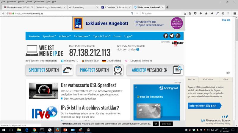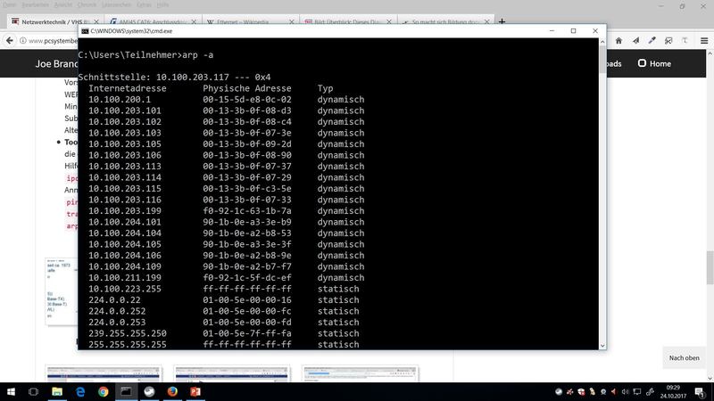 Anm.: über Windows-GUI mittels Netzwerk- und Freigabecenter - Adapter - ... Detailsping www.bahn.de(der Profitest für eine funktionsfähige Onlineverbindung für einen Rechner)tracert www.stanford.edu(Route der Pakete durch das Internet zum Zielrechnerarp -a(Adress Resolution Protocol - Zuordnungen von MAC-Adressen zu IPv4-Adressen)