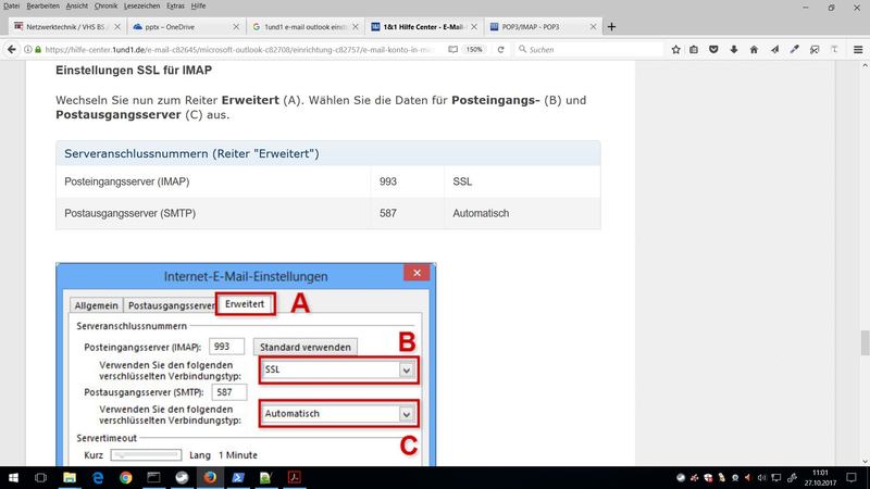 Sicherheit bei der Nutzung, Konfigurationen für den Client Outlook (beispielhafte Anleitung, effizientiere E-Mails mit IMAP; Darstellungen zu IMAP im Seminar, Hilfelink 1und1),
