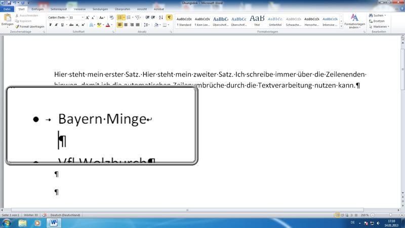 Trick: für Zusatzzeilen in Aufzählungen (oder Nummerierunen) einfach am Ende einer Zeile die Kombi Umschalten + Return drücken - hierdurch erhält man eine neue Zeile und das Format bleibt sauber ausgerichtet - Tabulatoren