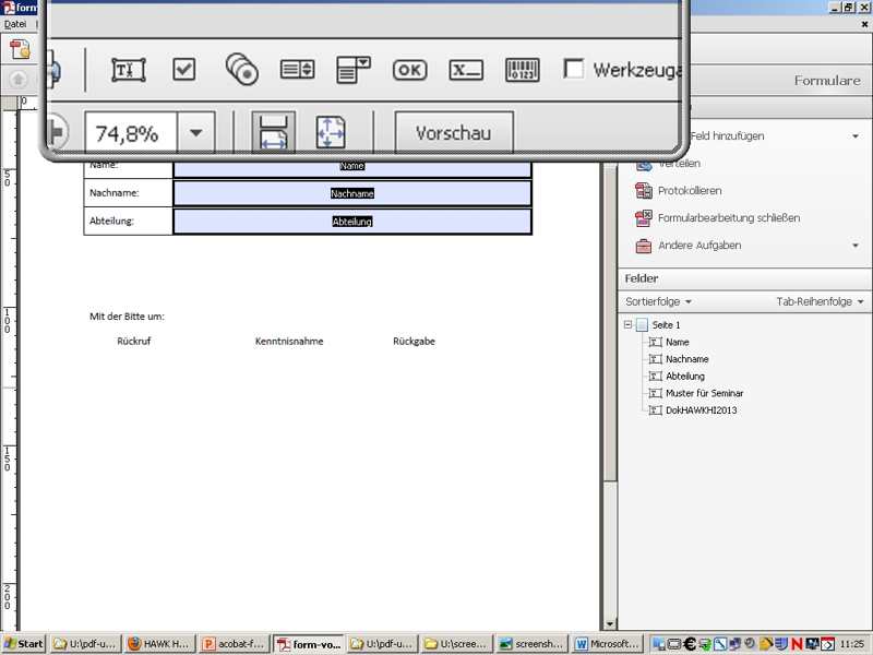 Erstellungsprozess (s.o) exemplarisch durchgeführt und die automatischen Felderkennungen von Acrobat entdeckt und eingeschätzt