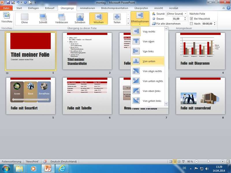 Folienübergänge von Folie zu Folie, Anzeige von Eigenschaften unterhalb der Folien in Ansicht Foliensortierung - Animationen (Ribbon)