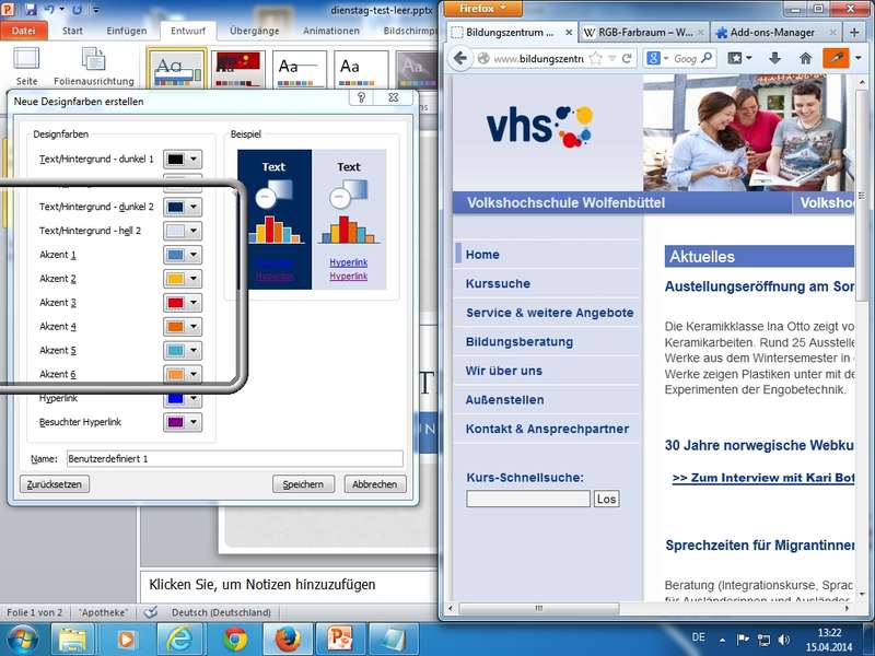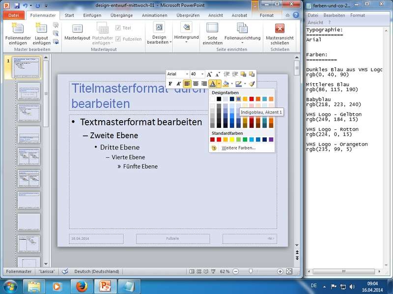 Einrichtung einer eigenen "Farbpalette" mittels Farben - Neue Designfarben erstellen... - Zuweisung von geplanten Farben auf Farbpalette unter Nutzung von RGB-Farbcodes (Rot, Grün, Blau - additive Farben) - Designentwurf
