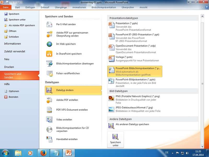 Per E-Mail senden, Als PDF senden, Bildschirmpräsentation übertragen, Dateityp ändern (Achtung: PowerPoint-Bildpräsentation hat auch pptx Endung), PowerPoint-Bildschirmpräsentation (*.ppsx - lassen sich manuell über Datei - Öffnen wieder mit PowerPoint bearbeiten)