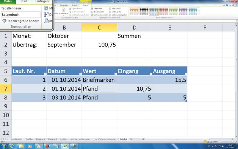 neue 2007/2010er Technologie - unterschätzt als einfache "Design-Technik" zum Einfärben von Tabellenbereichen; unter der Haube aber komplett neue intelligente "Datenbank"-Technik mit einfachen und sicheren Möglichkeiten zum Sortieren und Filtern von Informationen; außerdem lassen sich diese Tabellenbereiche sinnvoll benennen und damit "sprechende" Formeln erzeugen: =SUMME(Kassenbuch[Eingang])