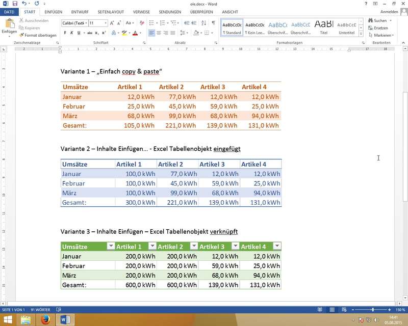 2) Inhalte einfügen... - Einfügen Excel-Objekt - Doppelklick bearbeitet Objekt mit Excel