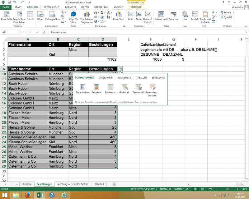 Zusammenhang mit DB-Funktionen (DBSUMME, DBANZAHL); auch hier wieder Einsatz von "Als Tabelle formatieren..."