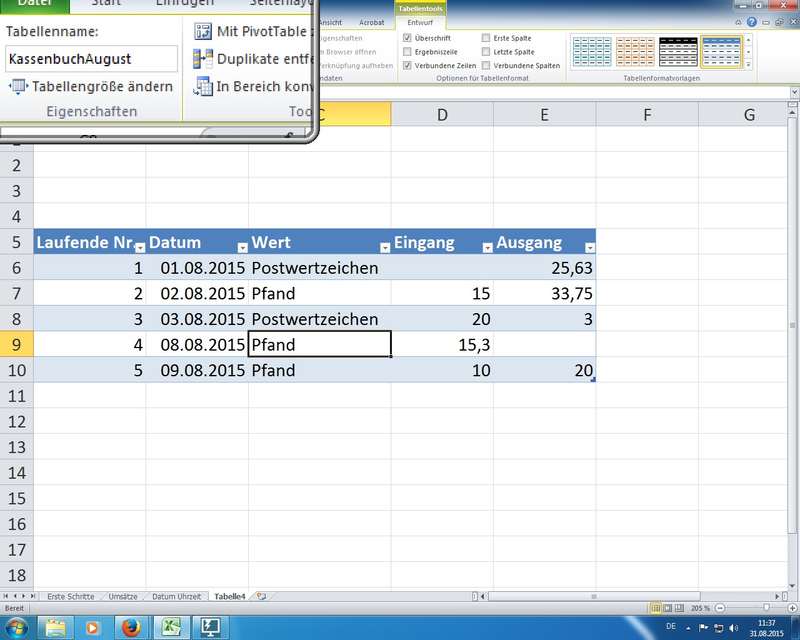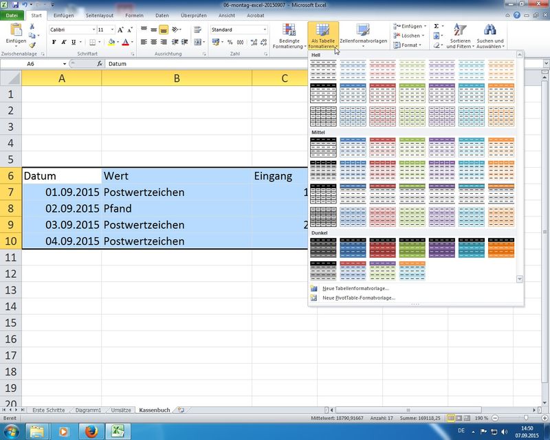 neue 2007/2010/2013er Technologie - unterschätzt als einfache "Design-Technik" zum Einfärben von Tabellenbereichen; unter der Haube aber komplett neue intelligente "Datenbank"-Technik mit einfachen und sicheren Möglichkeiten zum Sortieren und Filtern von Informationen; außerdem lassen sich diese Tabellenbereiche sinnvoll benennen und damit "sprechende" Formeln erzeugen: =SUMME(Kassenbuch[Eingang])