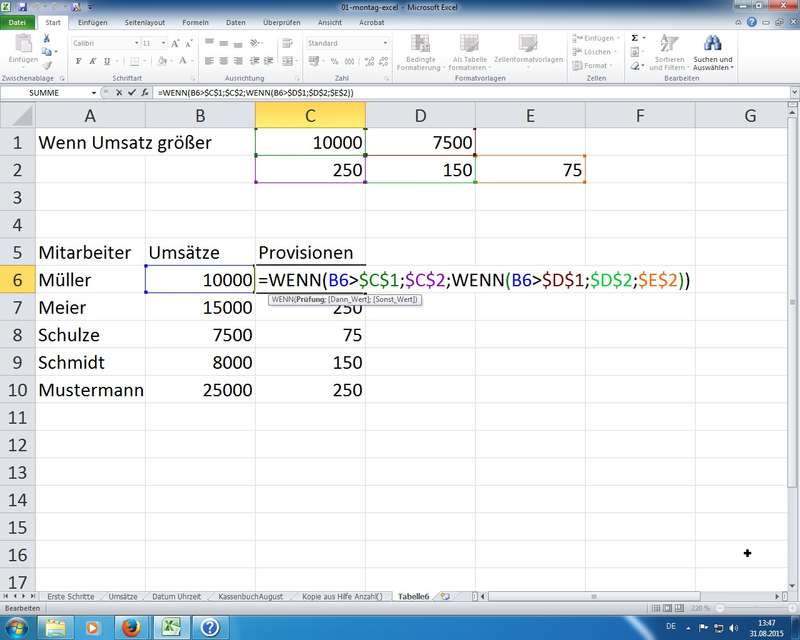 Nutzung von Zellen für Vergleichswerte in Prüfungen und für Berechnungen in den Dann/Sonst-Zweigen verlangen wieder nach den absoluten Zellbezügen, damit sich die Funktionen auch sauber kopieren lassen (nach unten ziehen lassen) - SVERWEIS Funktion