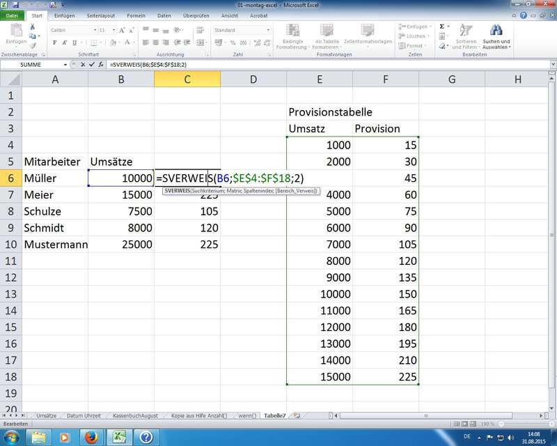 =SVERWEIS( B4 ; Provisionstabellenblatt!$A$2:$E$6 ; 2 )