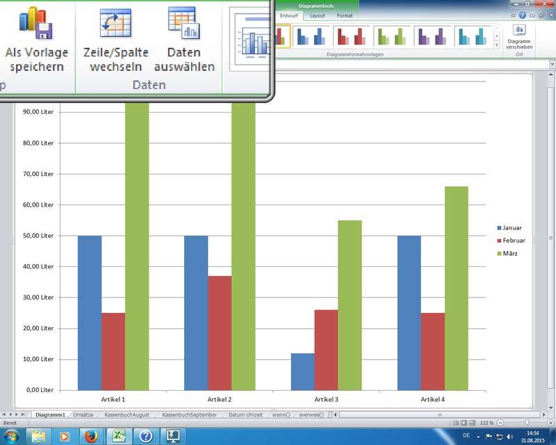 Umsatztabelle inklusive Spalten- und Zeilenbeschriftungen (Artikel, Monate) markiert und mittels Funktionstaste F11 ein "Schnelldiagramm" erstellt in Form eines neuen Diagrammblatts; Wechseln der X-Achse und Legendenzuordnung mittels neuem Ribbon Diagrammtools - Entwurf - Zeile/Spalte wechseln - Benutzerdefinierte Zahlenformate