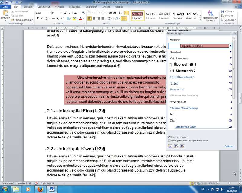 Anm.: Beachten Sie auch den Beitrag zum Dienstag dieser Seminarreihe (01.09.2015) - Themenvorgaben: Word 2010 Spezial - Formatvorlagen, Dokumentvorlagen, Autotexte, Arbeiten mit Feldern