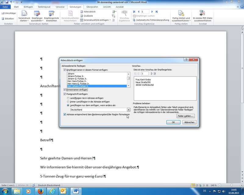 so passen Adressblock und Grußzeile sofort (wenn die Daten alle sauber in Outlook eingetragen wurden