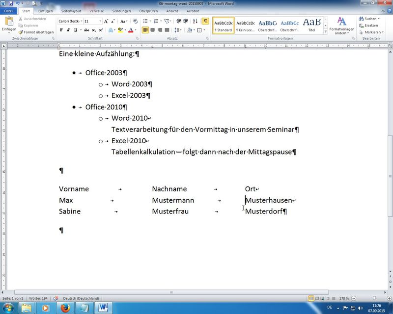 Übung siehe Kopf-/Fußzeilen; eigene kleine Liste mit linksbündigen Tabulatoren erstellt; Handling der Tabulatoren-Positionen über das Lineal - dort auch Einzüge links, erste Zeile, hängend, rechts - Absatz- und Zeichenformatvorlagen