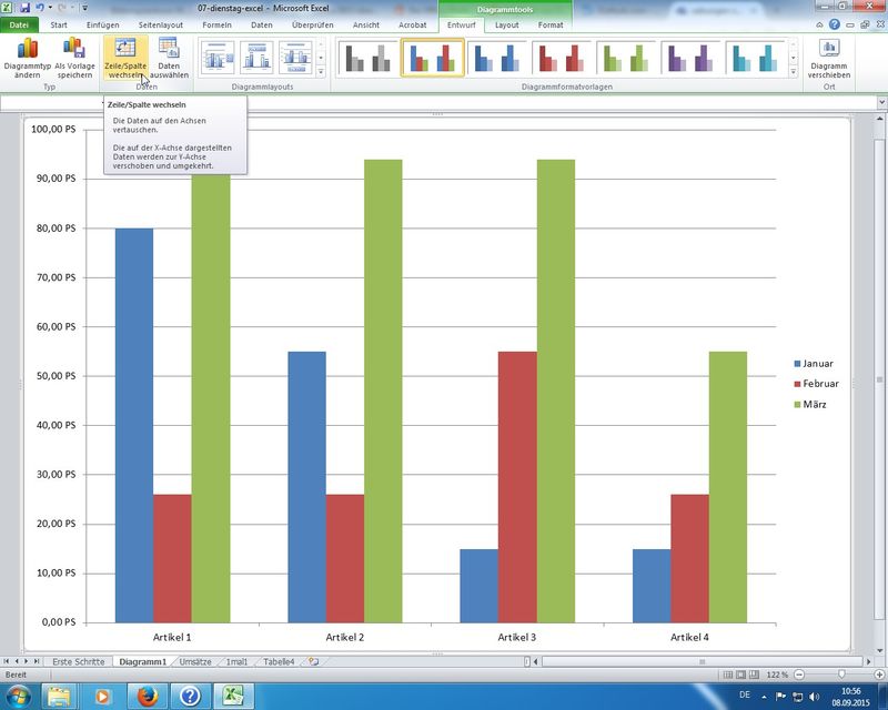 Umsatztabelle inklusive Spalten- und Zeilenbeschriftungen (Artikel, Monate) markiert und mittels Funktionstaste F11 ein "Schnelldiagramm" erstellt in Form eines neuen Diagrammblatts; Wechseln der X-Achse und Legendenzuordnung mittels neuem Ribbon Diagrammtools - Entwurf - Zeile/Spalte wechseln