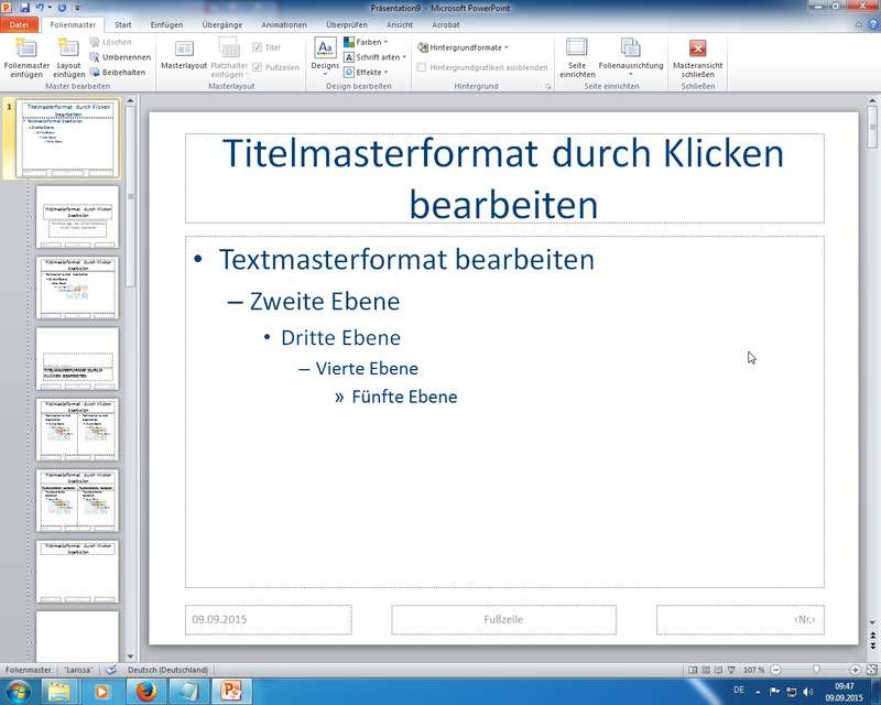 so ändern sich dann in allen Folien einheitlich die Formatierungen, Hintergründe, Text/Überschriften Positionen