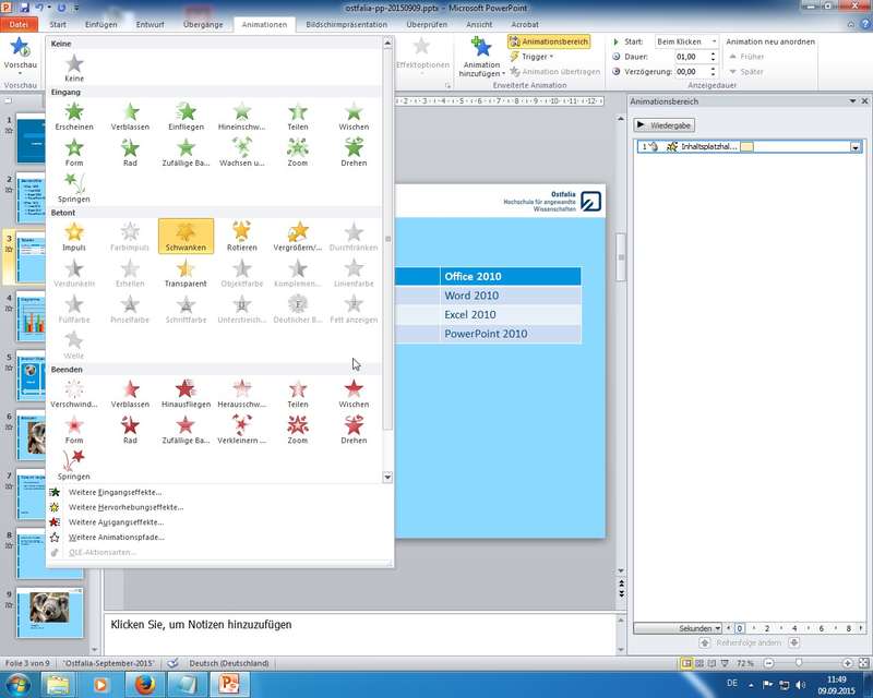 auf einer Folie für einzelne Objekte (z.B. Titel, Aufzählung, Grafik, ...) vielfältig einstellbar, viele neue Animationen, bitte Ansicht Folie - Bildschirmpräsentation (Ribbon)