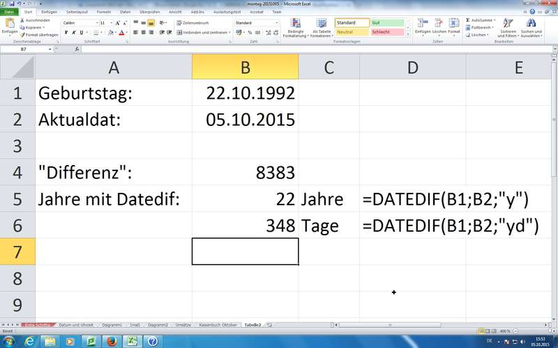 Berechnung von Datumszelldifferenzen in Jahren (Schalter "y"), Monaten ("m") oder Kombinationen;