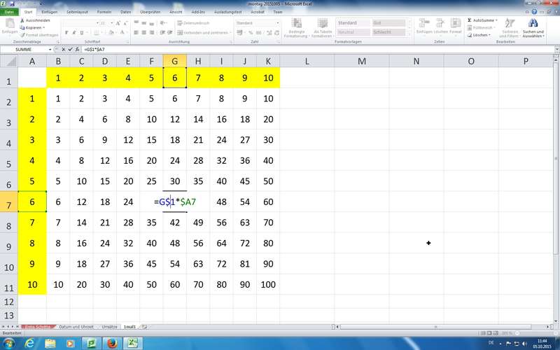 Übung: gemischte relative/absolute Zellbezüge bei "kleinem 1-Mal-1" (Formel: =B$1 * $A2 ) - Diagramme - Diagrammblatt auf Knopfdruck
